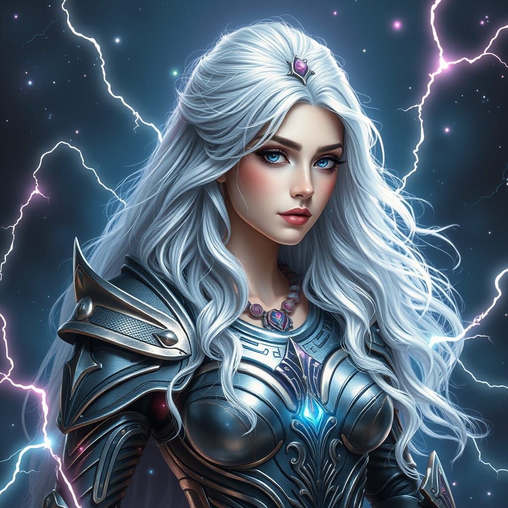 Create stunning fantasy princess images with our free AI image generator, featuring cosmic armor and celestial hair.
