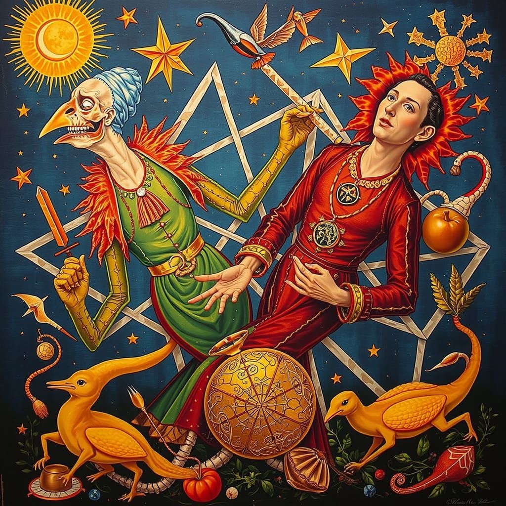 A hallucinatory scene reminiscent of Hieronymus Bosch, filled with vibrant colors and geometric precision. The image presents an eccentric and enigmatic composition with organic and systematic elements.
