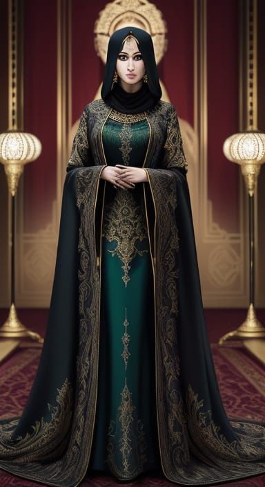 A digital matte painting showcasing a confident, modern businesswoman in a majestic, royal-inspired abaya. Features ornate golden embroidery, flowing silk, and vibrant jewel tones.