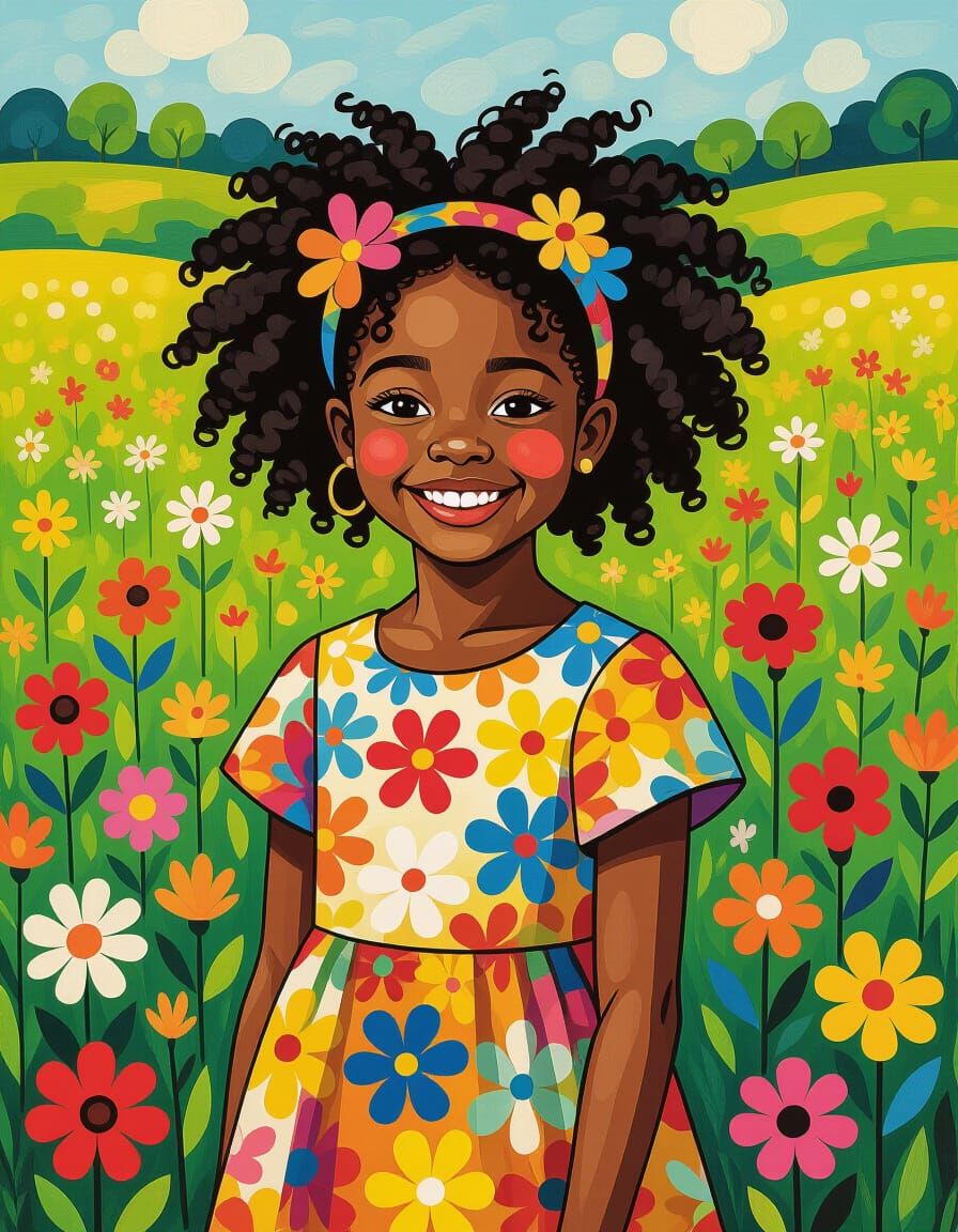 A vibrant image of a smiling young girl in a flower-filled meadow. The art style evokes early 20th-century modernism with bright colors and decorative patterns.