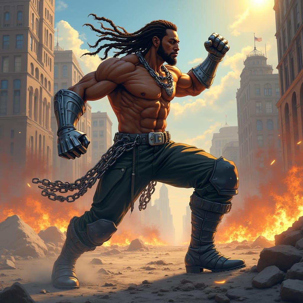 A digital artwork depicting a muscular Nigerian American warrior in chain mail pants engaged in hand-to-hand combat within a ruined city. The scene is rendered with cel-shaded techniques and deep colors.