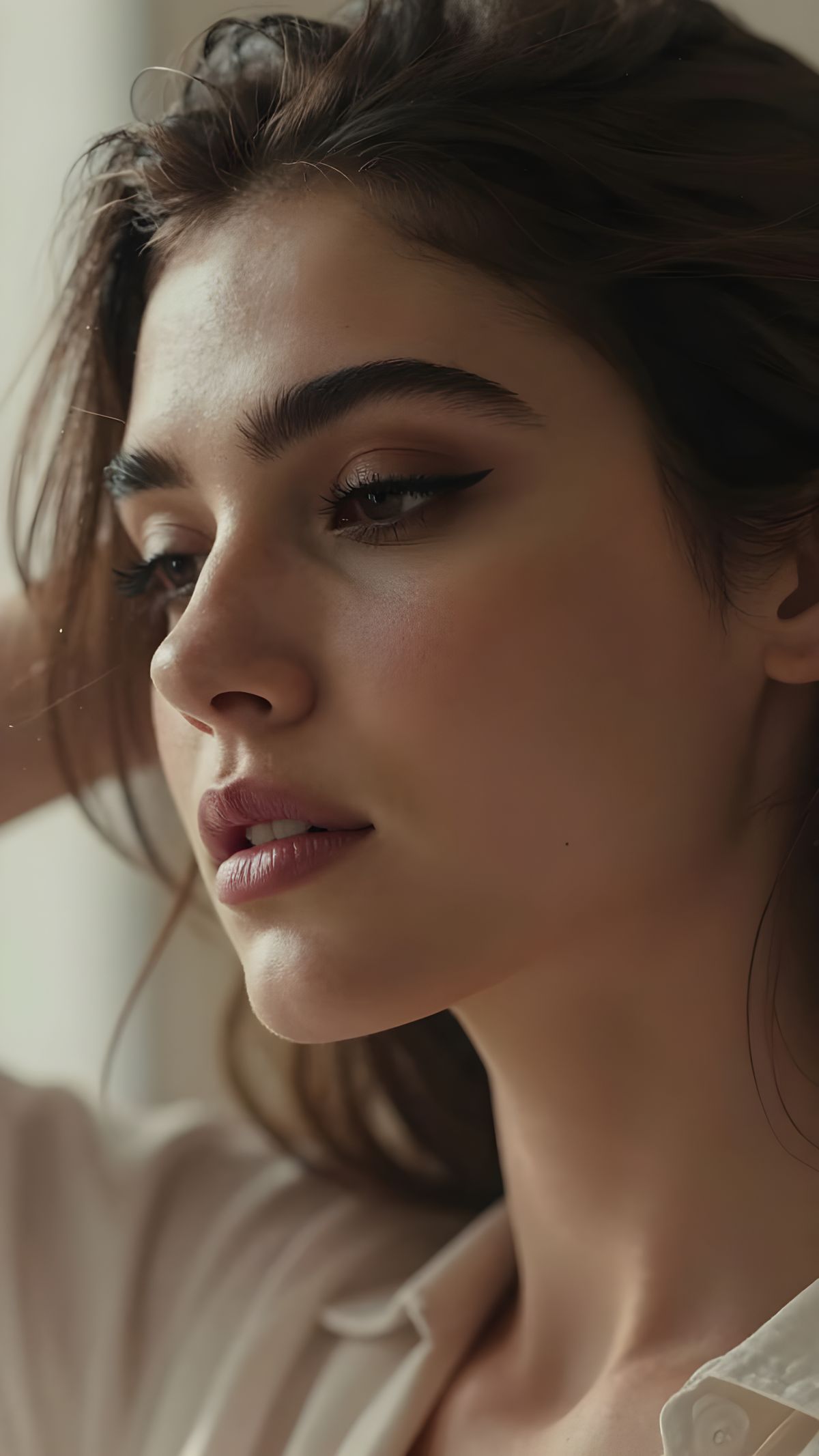 A hyperrealistic close-up of a young woman with Nordic and Indian features, detailed skin texture, and a dreamy gaze. Warm window light enhances her features in this intimate, cinematic portrayal.