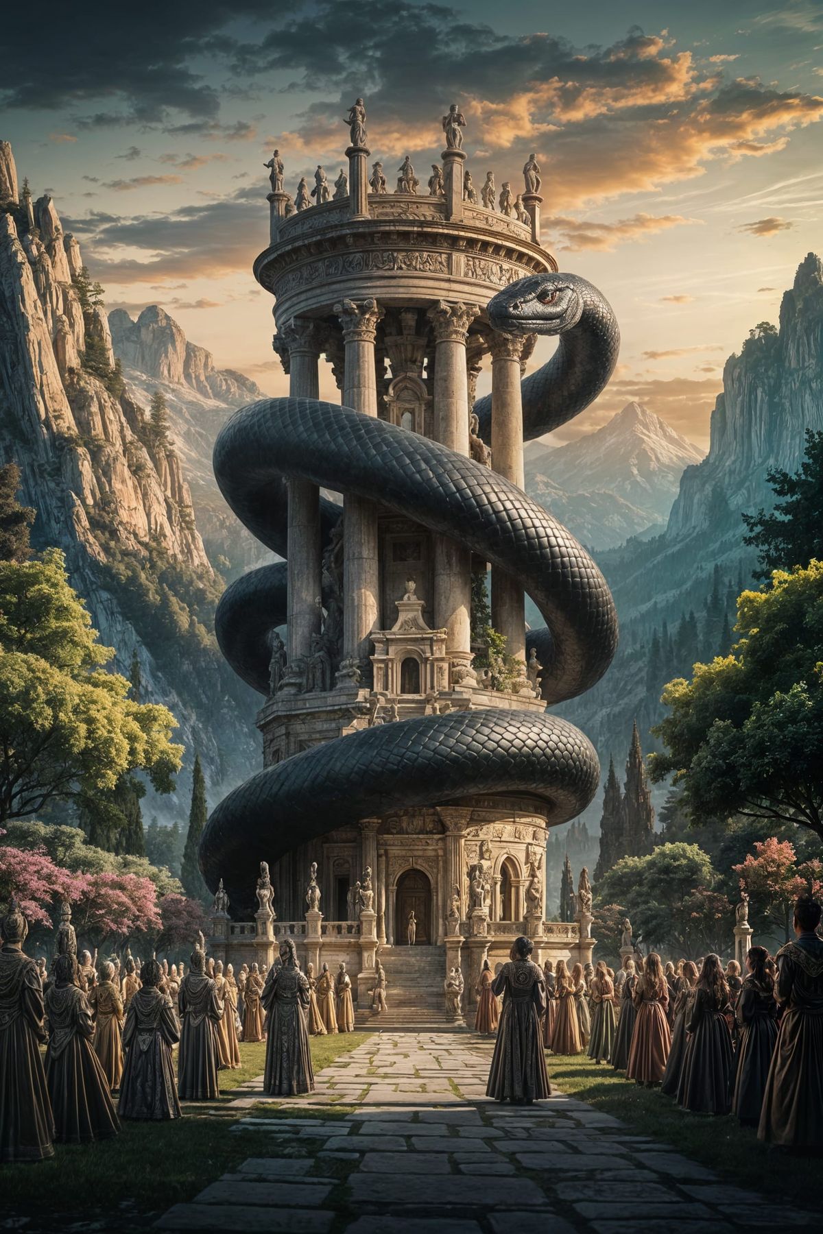 This image shows a colossal iridescent serpent coiled around an ancient tower with Doric columns, set in a fantastical landscape. A large crowd in robes surrounds the classical structure in soft golden light, suggesting a mystical, timeless realm.