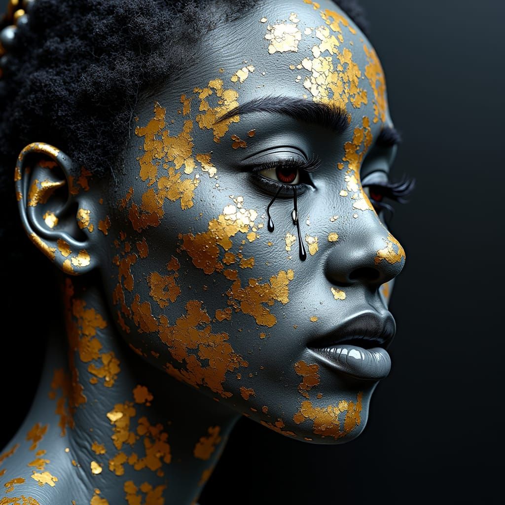 This image shows a portrait of a crying African woman in a maximalist 3D collage. The artwork features cracked acrylic, kintsugi porcelain, gold, and gold glitter on a black background.