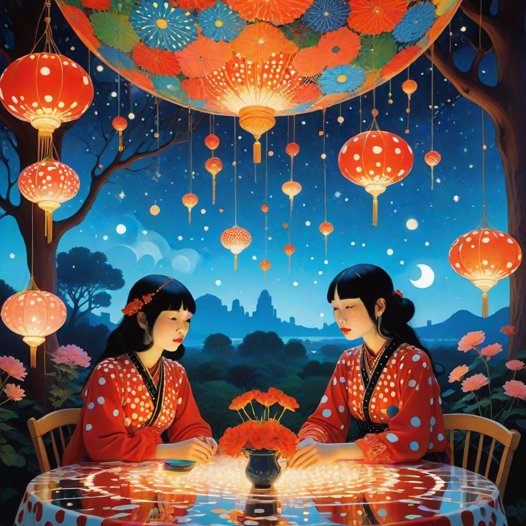 This image depicts a surreal floating island café bathed in starlight. Couples enjoy an intimate, romantic atmosphere amidst glowing flowers and celestial wonders.