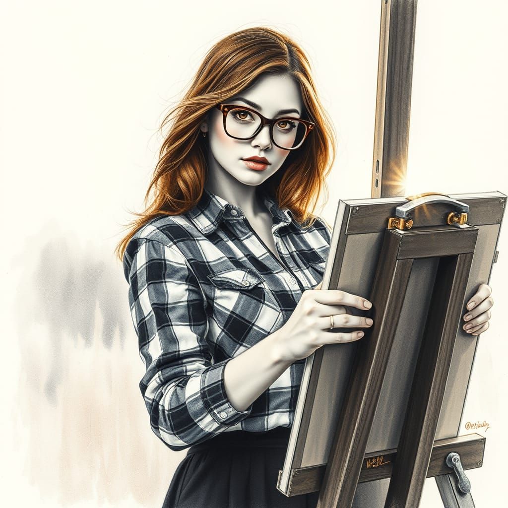 This image shows a brown-haired woman with copper eyes and glasses painting in the early morning sun. This hyperdetailed charcoal drawing captures the subject in a plaid shirt and black skirt.