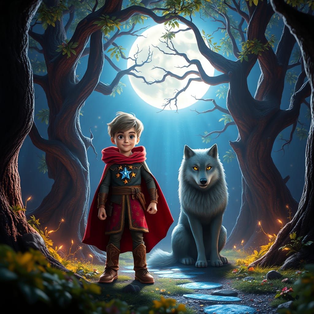 This image shows a magical boy and wolf in an enchanted forest. The scene is bathed in moonlight with a bright, colorful radial gradient background. The image is rendered as 3D digital art.