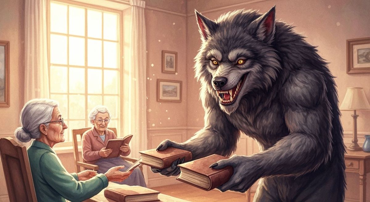 This image shows a smiling werewolf handing out books to elderly women in a nursing home. The watercolor image is a contrast between the creature's terrifying nature and its act of kindness.