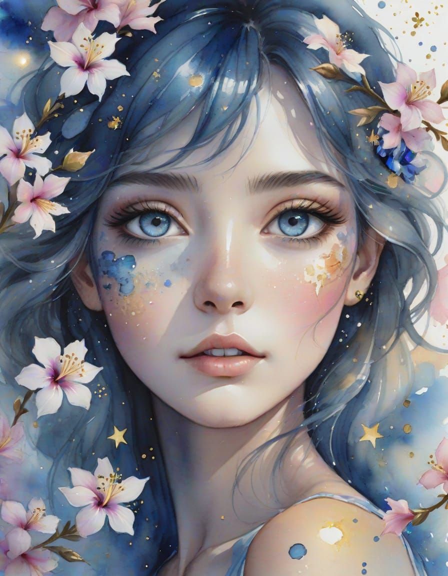 A close-up watercolor splash art image featuring sparkling gold and sapphire eyes. The eyes are adorned with golden stars and sapphire blue hibiscus flowers with shimmering gold accents.