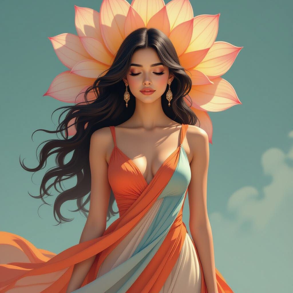 A young Indian, Caucasian woman, approximately in her late teens to early twenties, is depicted in a graceful pose, slightly angled to the right. She is fair-skinned with long, wavy black blonde hair flowing around her. Her face is serene, with closed eyes. A large, vibrant orange lotus flower partially ...