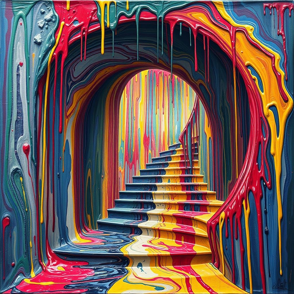 This image is a dreamlike depiction of a staircase, covered in dripping paint, reminiscent of M.C. Escher's impossible architecture, with bold, vibrant colors and a sense of mesmerizing movement, as if the staircase is melting like wax, with thick, heavy brushstrokes and a textured quality.