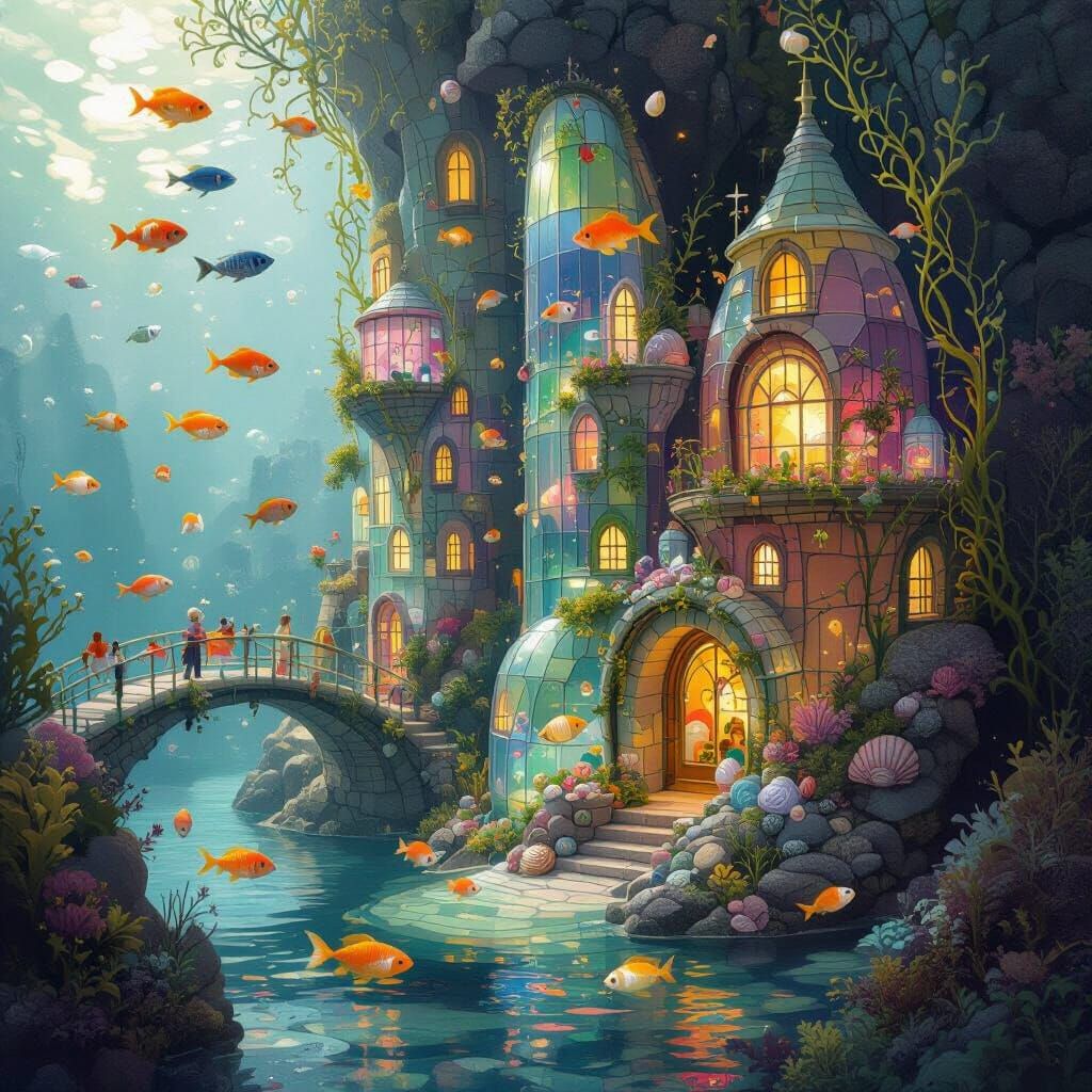 Design your own whimsical underwater cities made of sea glass. Free and easy AI image generation awaits!