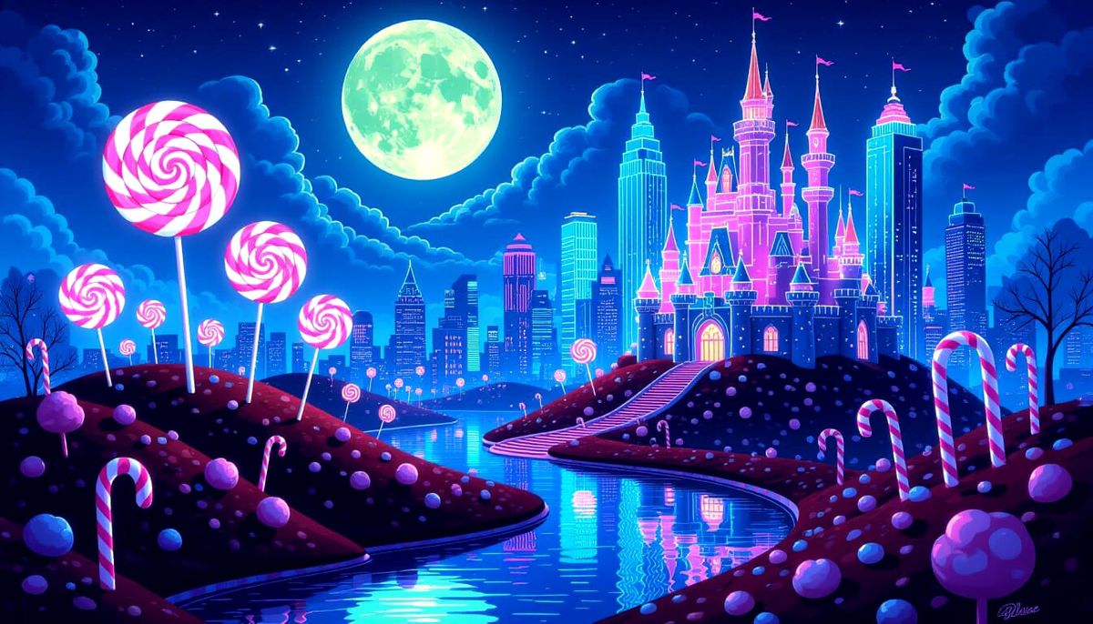 A glowing, surreal city skyline made of lollipops and sugar glass under a cotton-candy moon, with a chocolate river and candy cane trees in a gothic candy surrealism style.