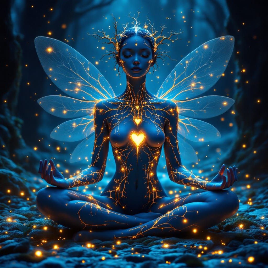 This serene image depicts a deep blue-skinned fairy in a meditative pose, surrounded by the mystical ambiance of an enchanted forest at night, with intricate, glowing veins and delicate, transparent wings, set against a dreamy, surreal backdrop of deep blues and purples.