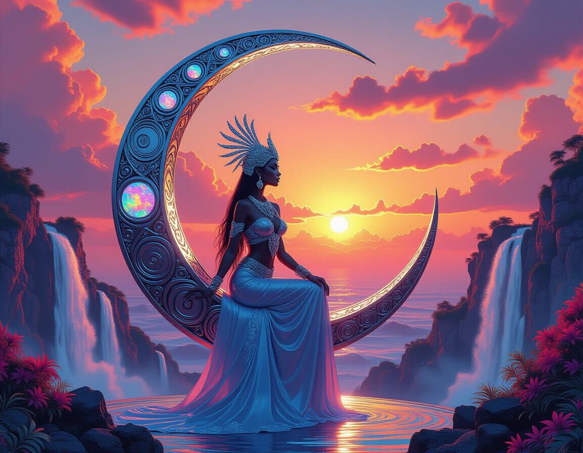 A vibrant image of a Hawaiian goddess in a fantasy setting. The goddess is adorned with a silver crescent moon, surrounded by indigo waterfalls, set against a pink and orange sunset in a maximalist digital art style.