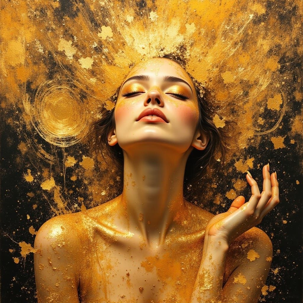 This hyperrealistic oil painting depicts a joyous subject bathed in golden light, with cosmic nebulae and stars. It features impasto texture and visible brushstrokes, evoking a dreamlike, ecstatic mood.