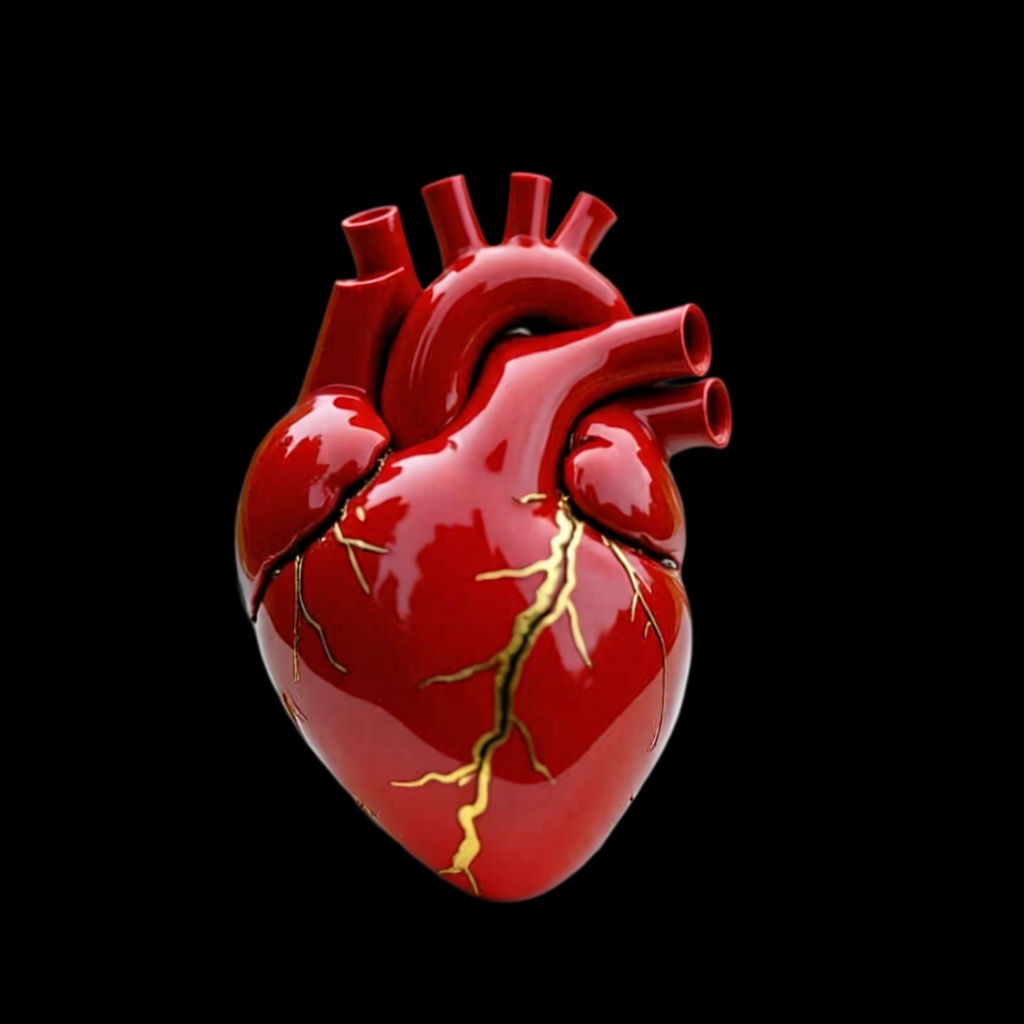 This image features a red porcelain heart repaired with the Japanese art of kintsugi, highlighting its golden seams and delicate beauty.