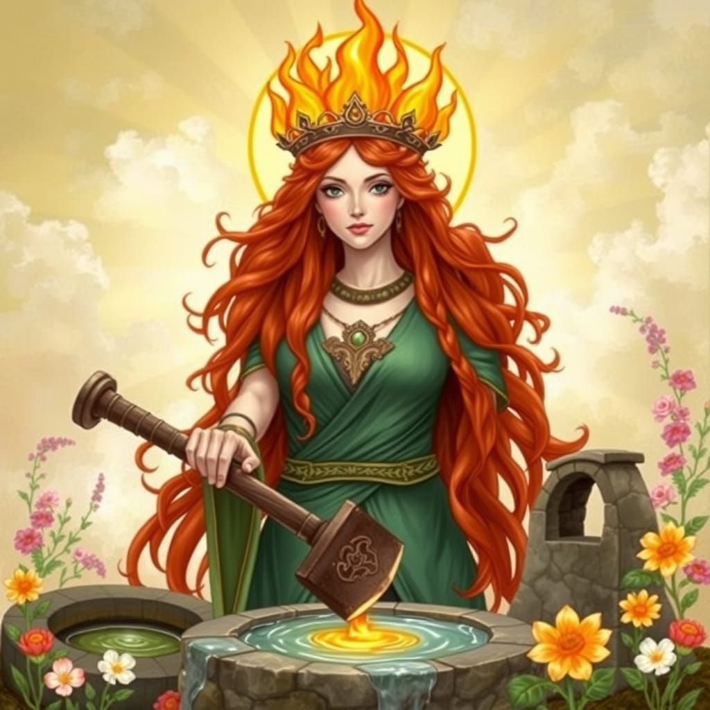 This image shows the Celtic goddess Brigid with red hair and a crown of flames. She holds a blacksmith's hammer, surrounded by sacred wells and flowers in bloom.
