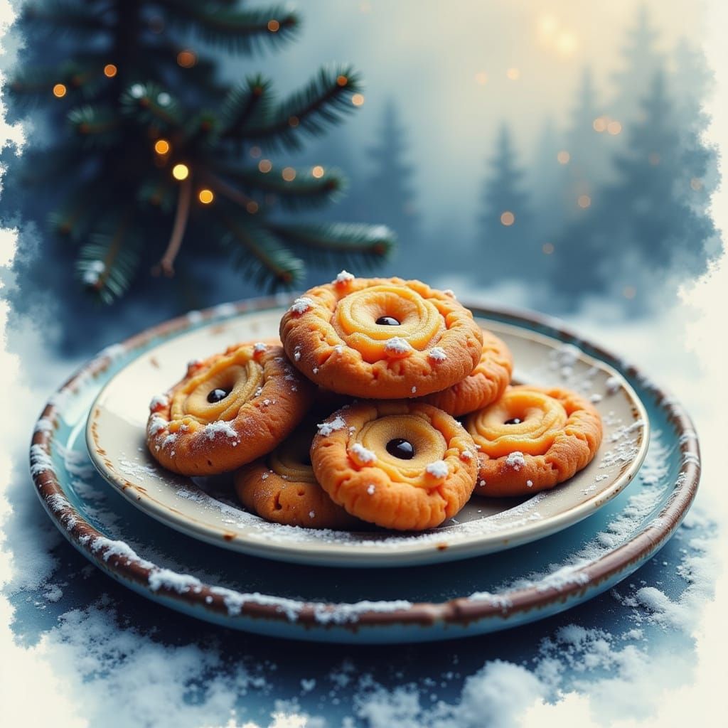 This image displays watercolour surreal cookies on a plate with a Christmassy double exposure background, rendered in an abstract style.