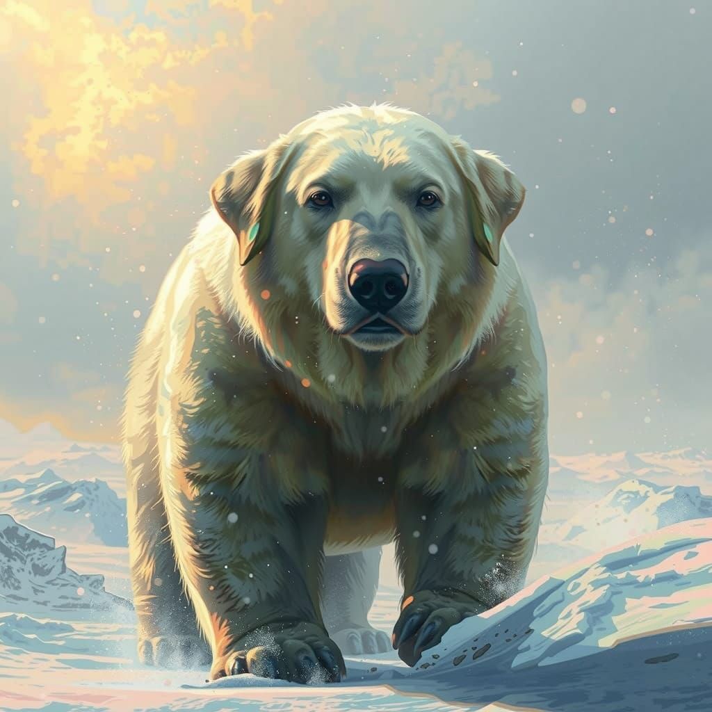 This image shows a polar bear with a Labrador's head in a snowy tundra. It features a blend of nostalgic futurism and vibrant colors with delicate lines, creating a breathtaking winter scene.