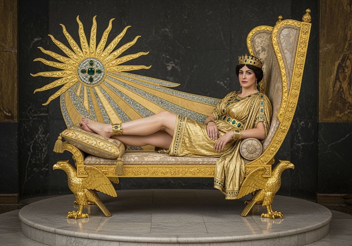 This image shows Empress Theodora of Byzantium in a luxurious throne room. She is elegantly posed on a chaise lounge with a rising sun design, in the style of Alphonse Mucha and Gustav Klimt.