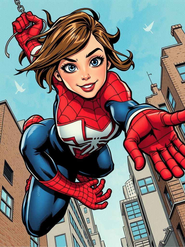 This image shows a dynamic young superheroine in a comic book-inspired Stan Lee art style, swinging into action as Spider-Girl, reminiscent of classic Marvel underground comix.