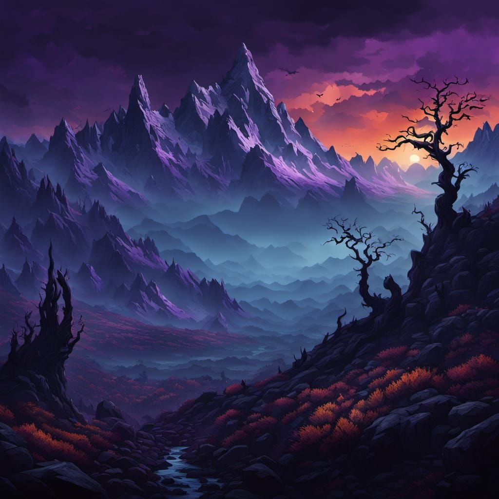 This image captures a haunting mountain range at dusk, bathed in vibrant purple and orange hues, with twisted tree silhouettes and ominous mist, creating an eerie atmosphere reminiscent of classic horror art
