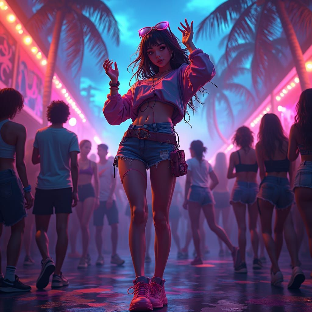A dynamic anime-style scene of a girl dancing in a Brazilian favela nightclub. The setting features neon lights, graffiti art, and silhouetted figures, capturing the energy of an EDM party in a vibrant, digital art style.