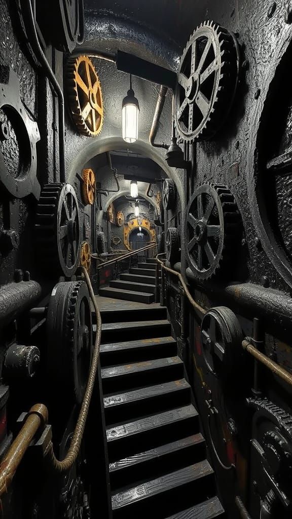 This image showcases a detailed 3D gears wallpaper with a trompe l'oeil effect, depicting a spiraling industrial staircase. It features a high-gloss oil paint finish with atmospheric lighting and contrasting colors.