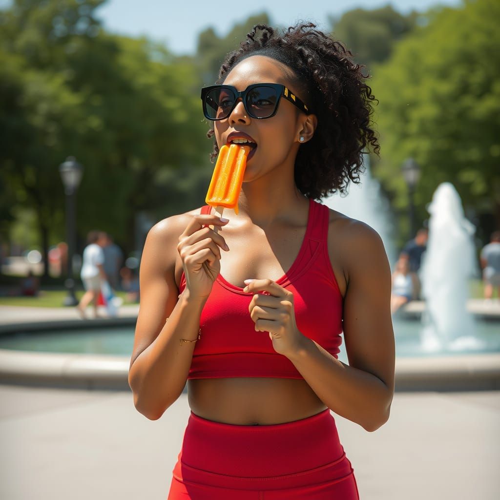 A hyperrealistic image of a Black woman in a red athletic suit and sunglasses, enjoying a melting orange popsicle in a sunlit park. Golden hour light enhances the vibrant colors.
