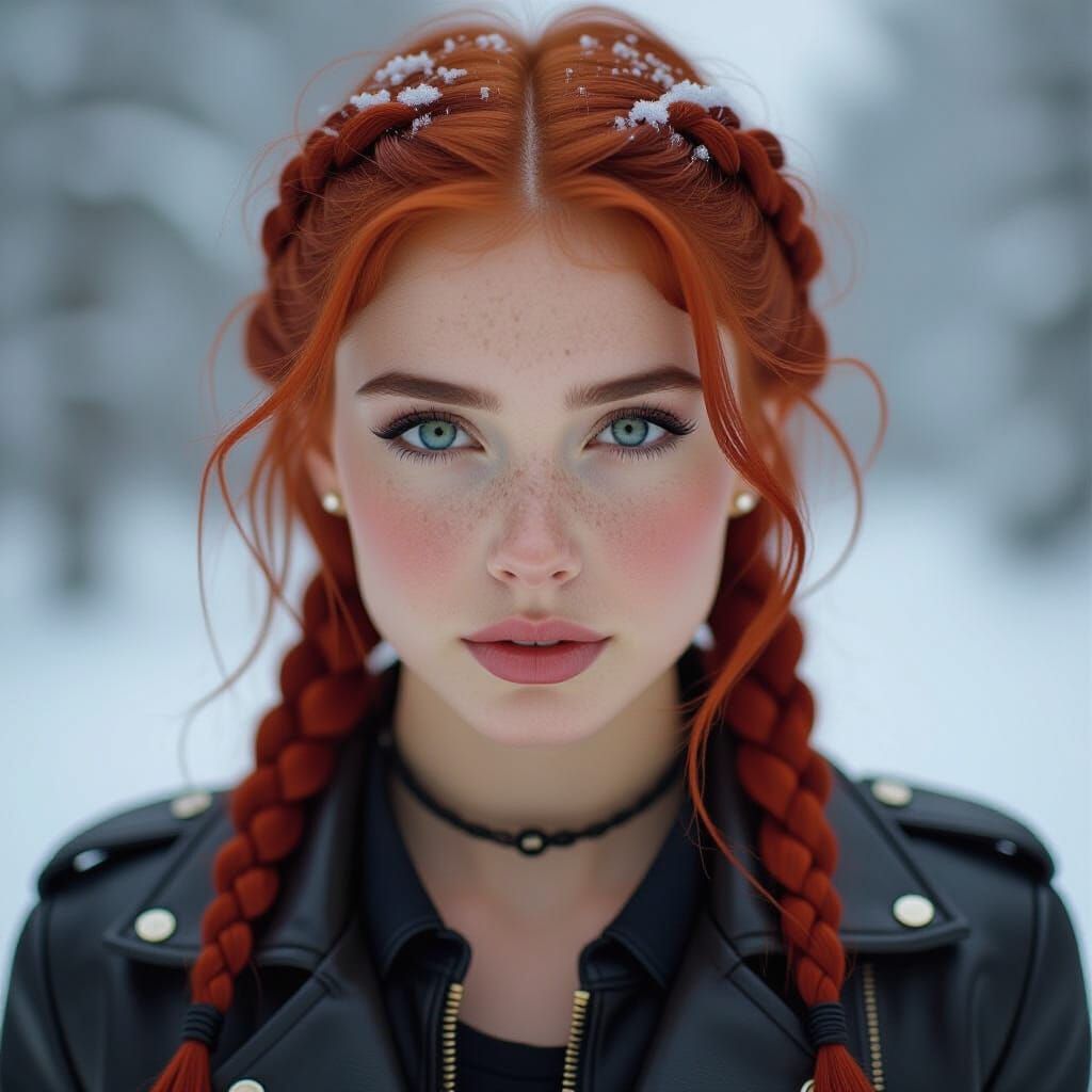 A photorealistic portrait of a young woman with vibrant red braided hair, blue eyes, and freckles, wearing a leather jacket with snow. Her intense gaze is captured in soft, natural light.