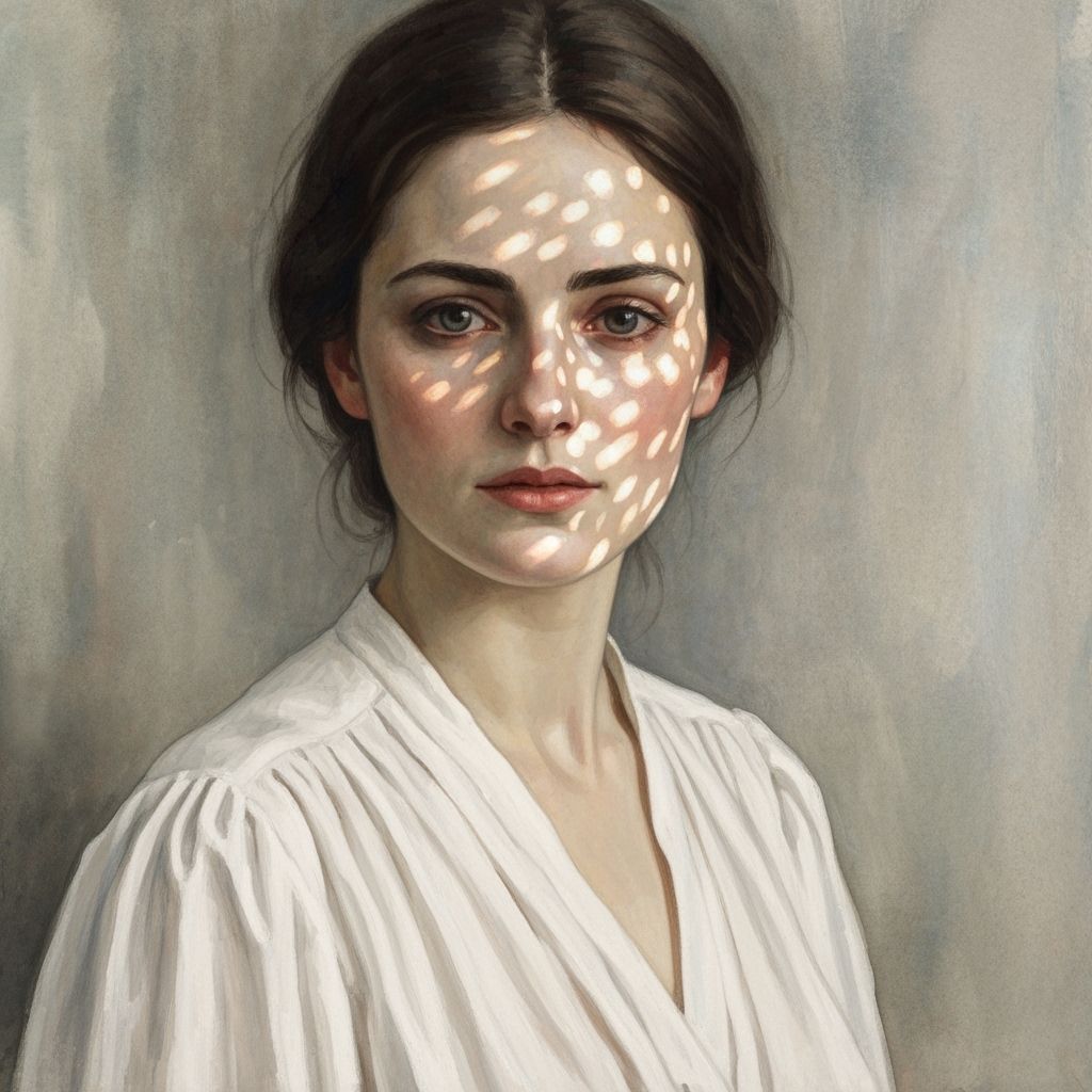 This image shows a woman with a thoughtful expression gazing at the viewer. She's wearing a white blouse and the image is rendered as impressionistic watercolor, with soft colors and dappled morning light.