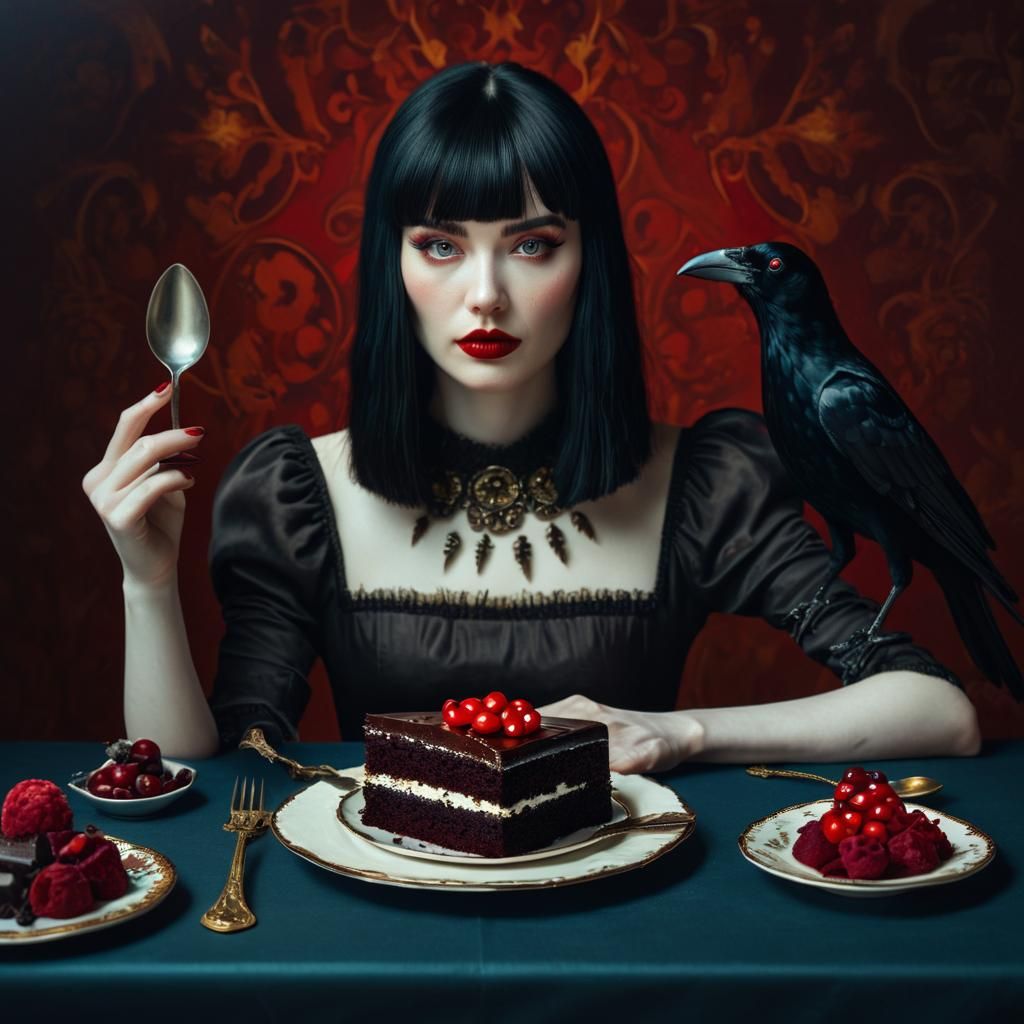 This hyper-detailed image captures a girl with pale skin and black hair, holding a spoon over chocolate cake in a moody, cinematic Victorian Gothic setting. Features soft golden light.