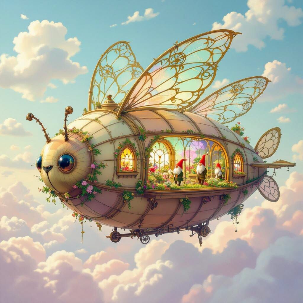 A whimsical airship shaped like a caterpillar floats in a pastel sky. The fanciful scene shows tiny gardens inside, rendered in an impressionistic style.