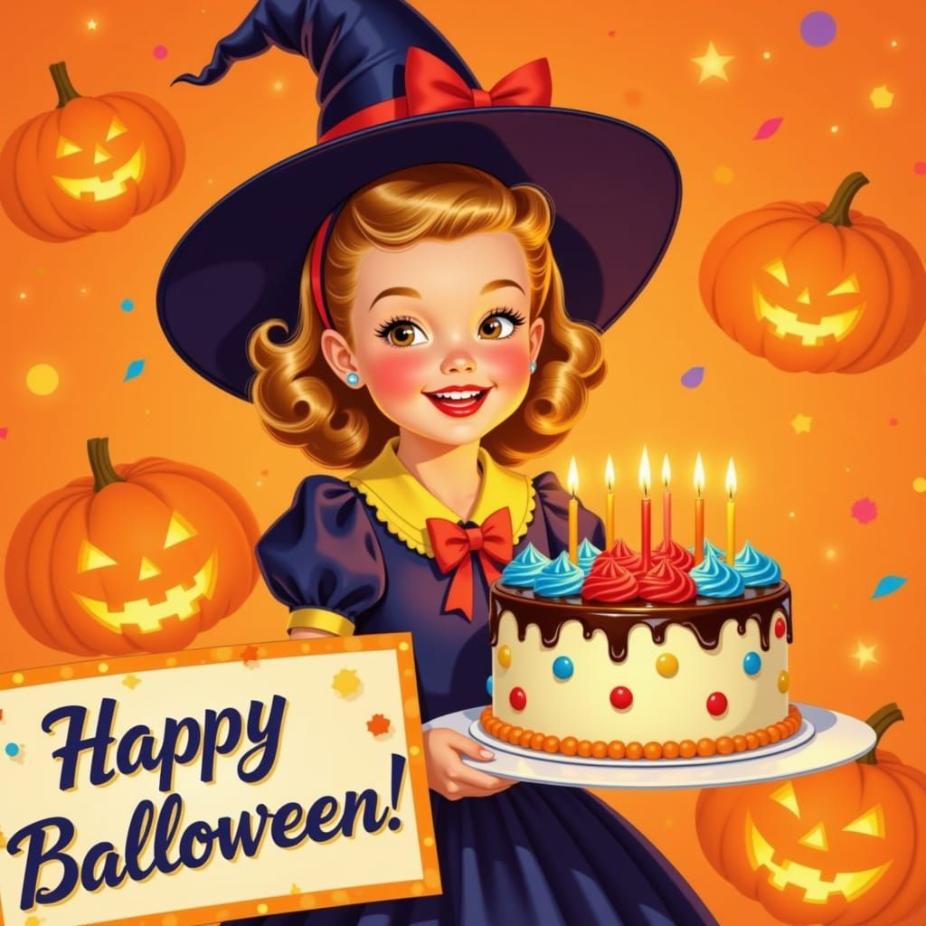A charming retro illustration of a 1950s girl in a witch costume holding a birthday cake. Features vintage font, glowing pumpkins, and confetti on a greeting card.