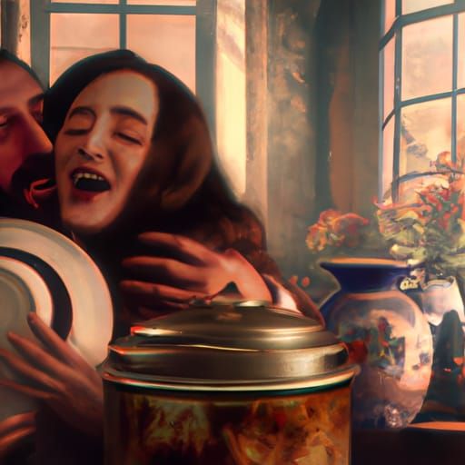 A surreal portrait of a laughing man and a crying woman, embracing in a living room filled with antique kitchenware. Close-up shot. In the style of surrealist oil painting, vibrant colors, juxtaposed elements, dreamlike atmosphere, intricate details. The lighting is soft and diffused, casting gentle ...