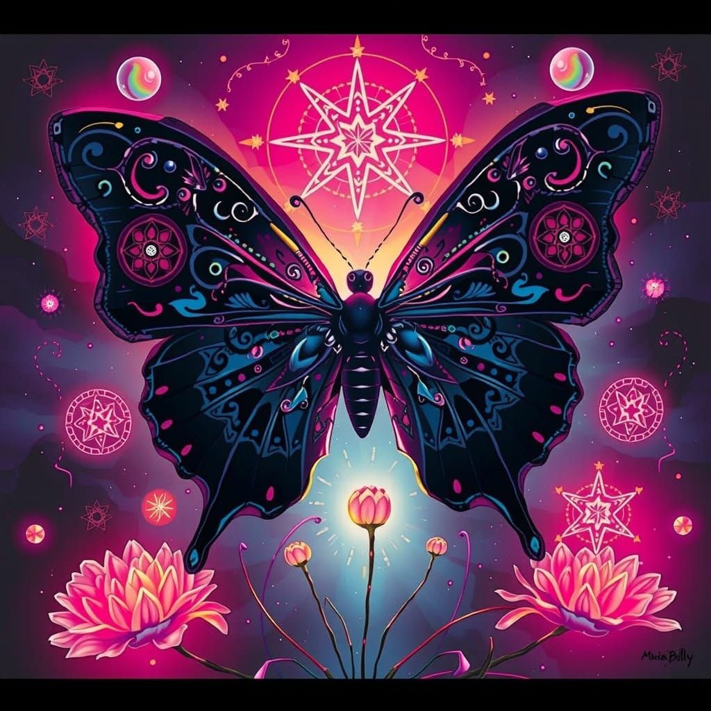 This image features a detailed black satin butterfly with intricate filigree patterns. It is set in an esoteric, mystical environment filled with vibrant, psychotropic colors, evoking a surreal digital painting style.