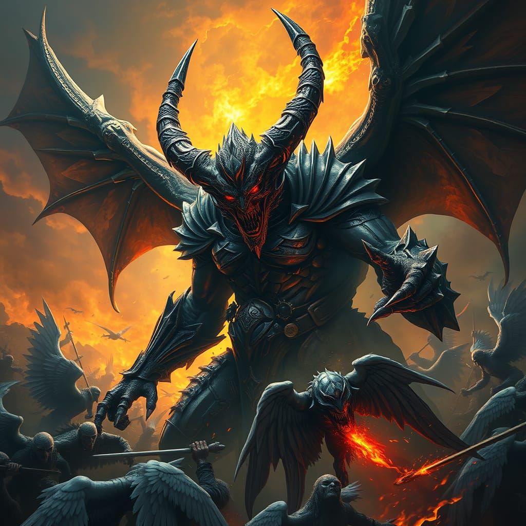 A dramatic shot of a demon in detailed armor battling angels. The vibrant background and side lighting create depth, reminiscent of detailed concept art.