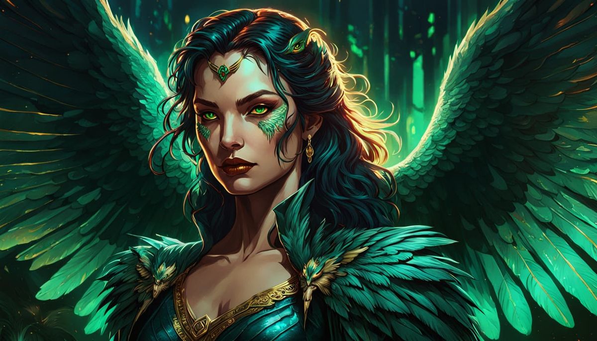 This image shows a striking, close-up concept art of a vampire woman with eagle wings and emerald tiger features. The artwork has vibrant colors and ethereal lighting, rendered in a comic book style.