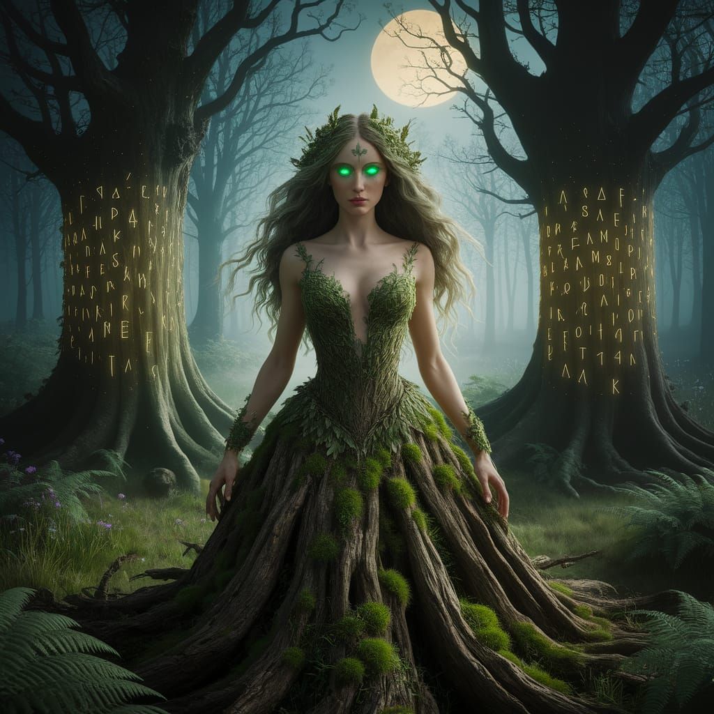 This image shows a Slavic forest spirit woman with glowing eyes, wearing a moss and bark dress, amidst a misty forest with glowing runes on trees, in an Arthur Rackham illustration style.