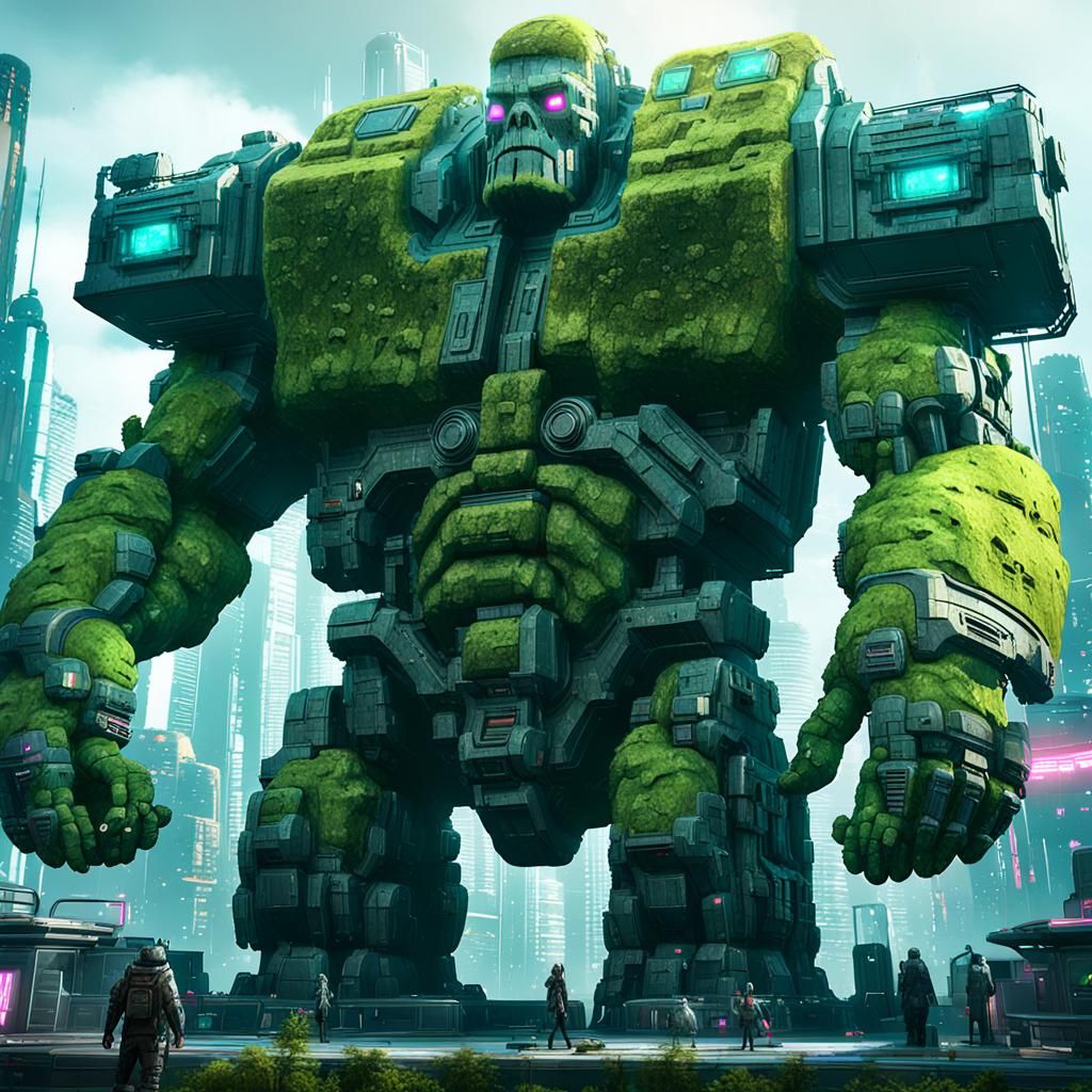 This image shows a moss-covered stone giant looming over a vibrant cyberpunk city. The scene is rendered with detailed 3D graphics, dynamic lighting, and a cinematic feel.