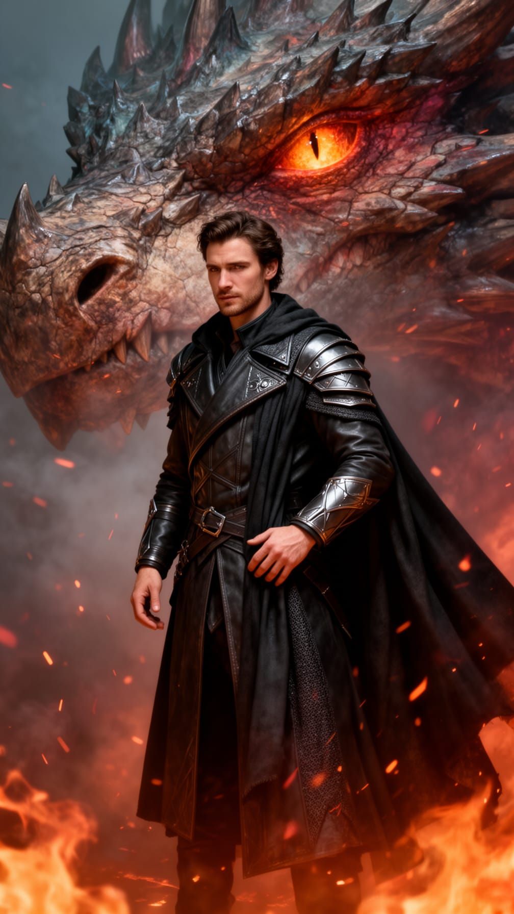 This hyperrealistic concept art features a regal figure in fantasy armor facing a colossal, glowing-eyed dragon amidst smoky, ember-filled air. Dramatic lighting and intricate detail create an infernal atmosphere.