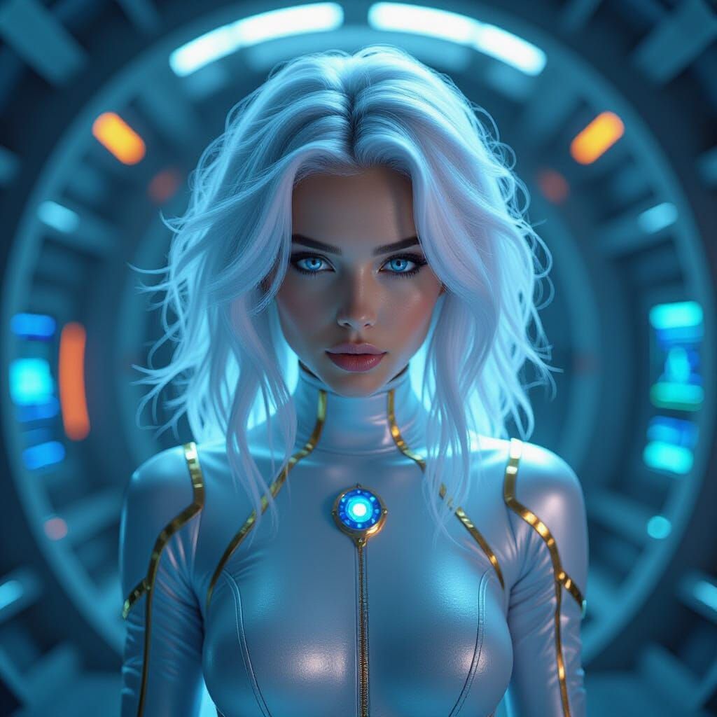 A striking picture of a futuristic woman with white hair and blue eyes floating in zero gravity. The figure is wearing a silver suit with golden accents in a cyberpunk aesthetic.