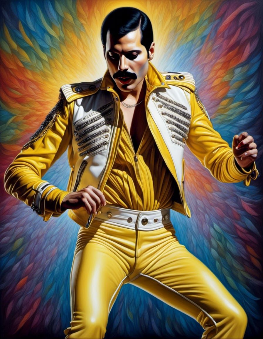 A striking oil painting on canvas of Freddie Mercury in a yellow leather jacket and white trousers. This artwork features an art nouveau punk aesthetic.