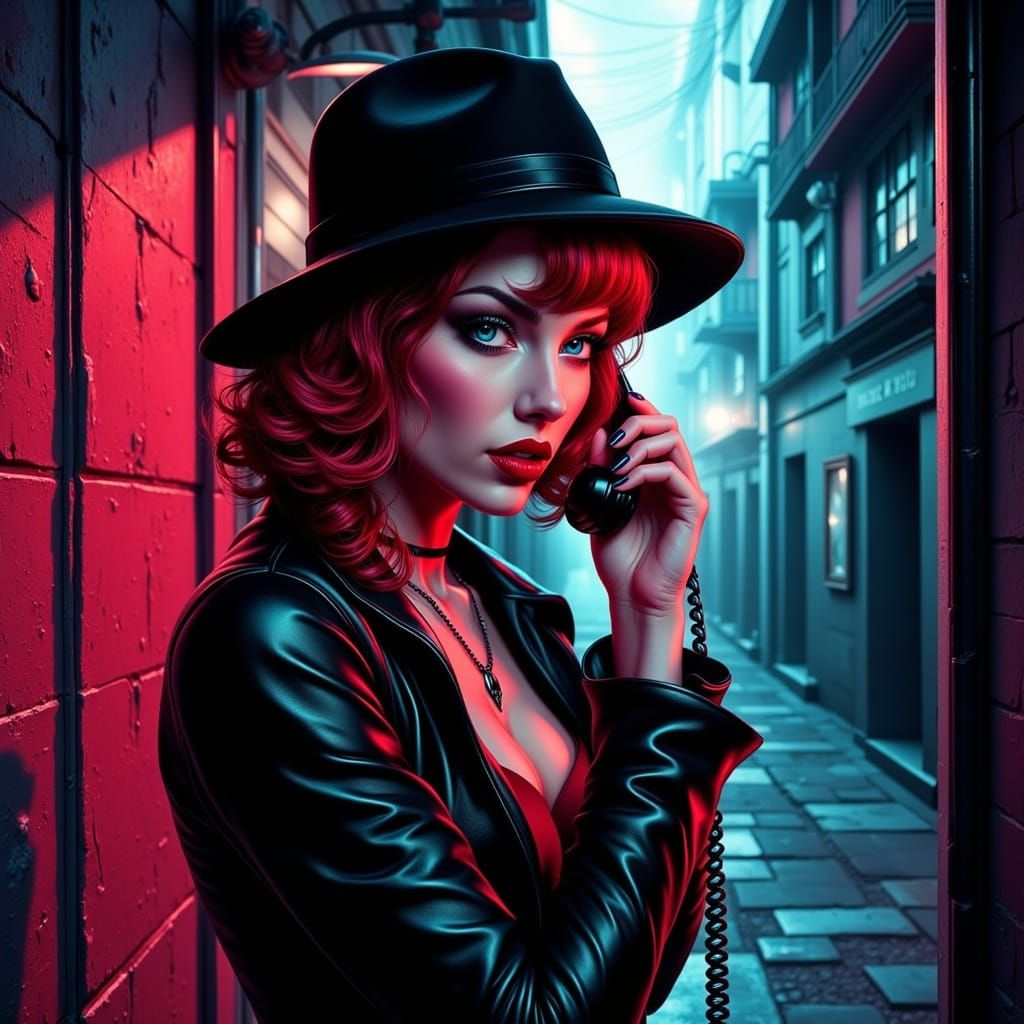 This image depicts a mysterious redhead in a fedora using a 1940s payphone in a foggy noir alley. It features bold neon colors and dramatic lighting in a pulp comic style.