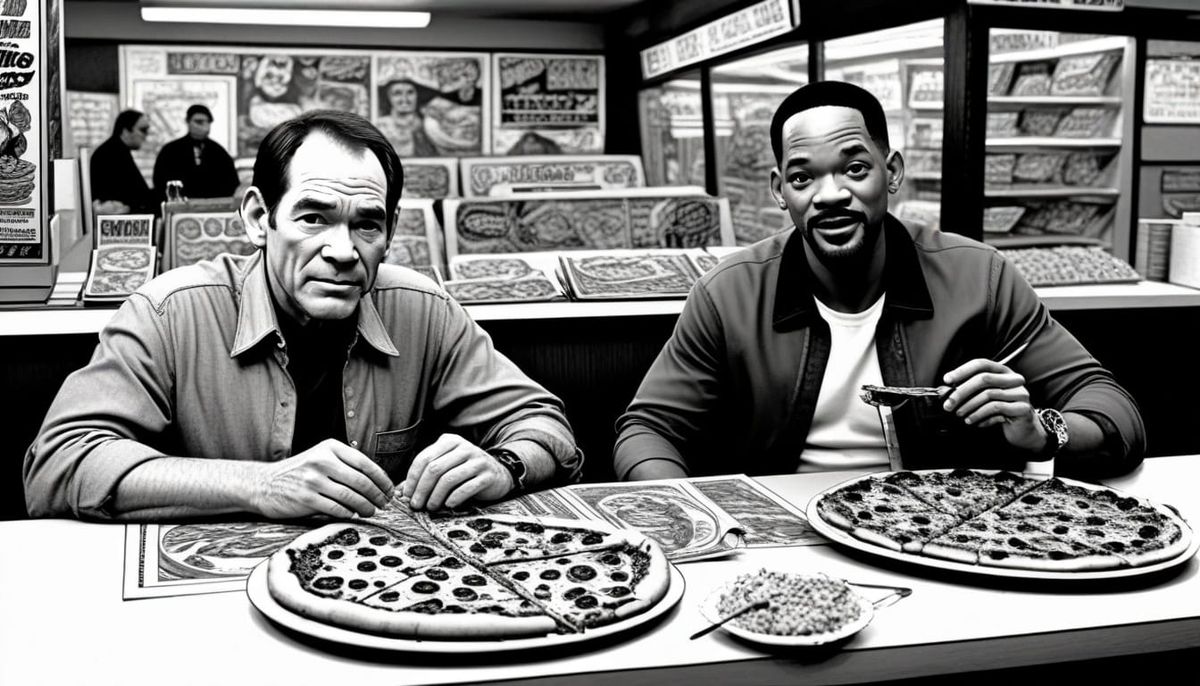 A black and white comic book style image of Tommy Lee Jones and Will Smith eating pizza at Chuck E. Cheese. The art features intricate details with crosshatching and stippling.