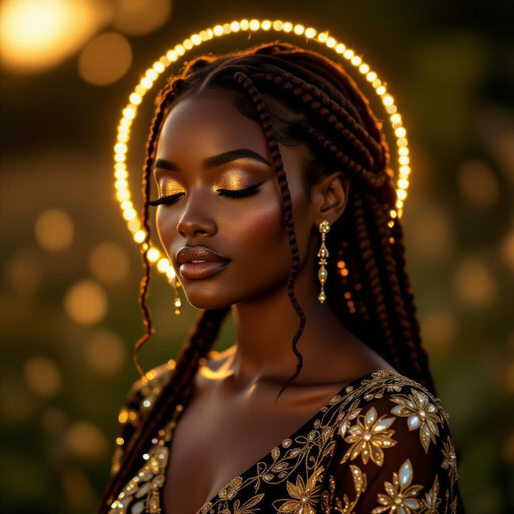 A striking picture of an African woman in profile, her skin luminous in the golden light. The portrait features shallow depth of field and rich detail, reminiscent of hyperrealistic photography.