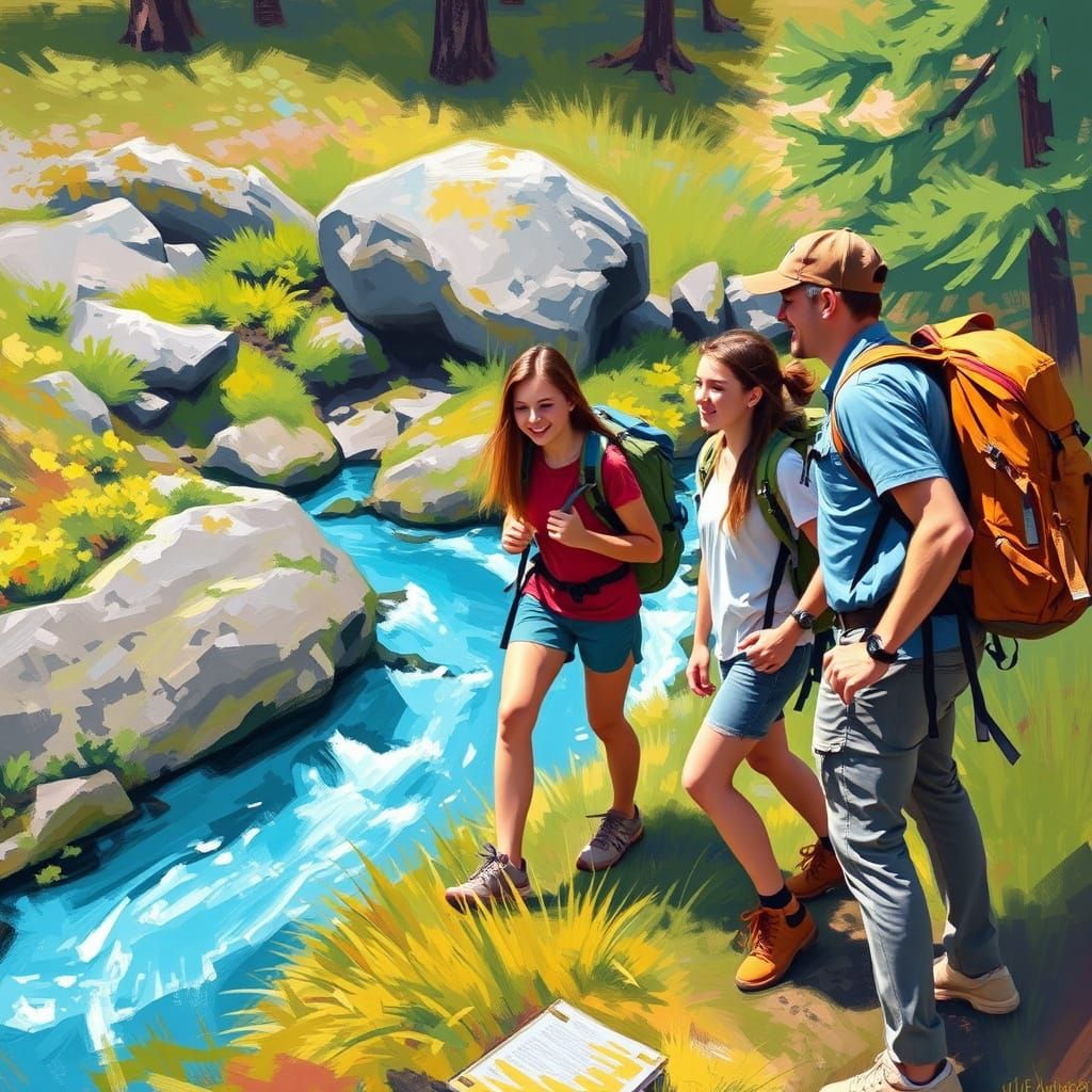 This image depicts young female students on an impressionistic hike beside a vivid blue stream, accompanied by a male guide. The scene is rendered in a dynamic, painterly style.