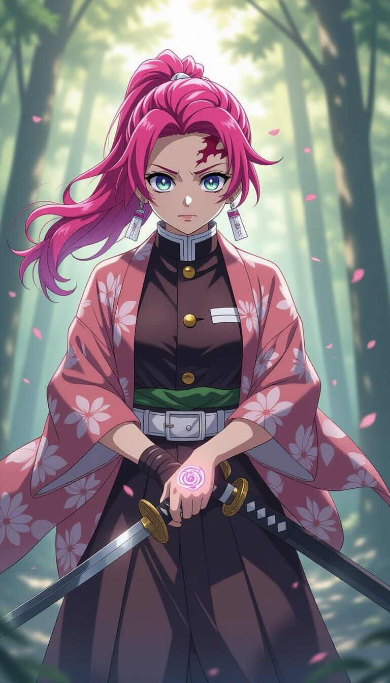 A digital illustration of Sakura Haruno as a Demon Slayer. She is depicted in a misty forest, wielding a katana with a pinkish aura, in a style reminiscent of anime art.