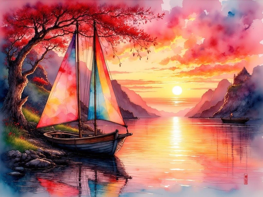 This image depicts a traditional Japanese fishing boat anchored near shore during a vibrant sunset. It features a painterly realism style with glowing impasto highlights and a dramatic chiaroscuro effect.